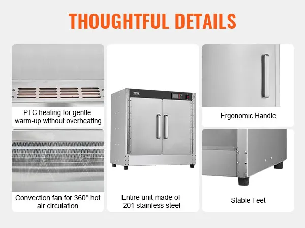 Stevige en duurzame constructie: gemaakt van verdikt 201 roestvrij staal, deze hotbox is stevig en bestand tegen vervorming. De praktische magnetische deur zorgt voor een goede afdichting om de warmte vast te houden. Het stevige ontwerp zorgt voor een gemakkelijke overgang van aanrecht naar vloer zonder de veiligheid of stabiliteit in gevaar te brengen.
