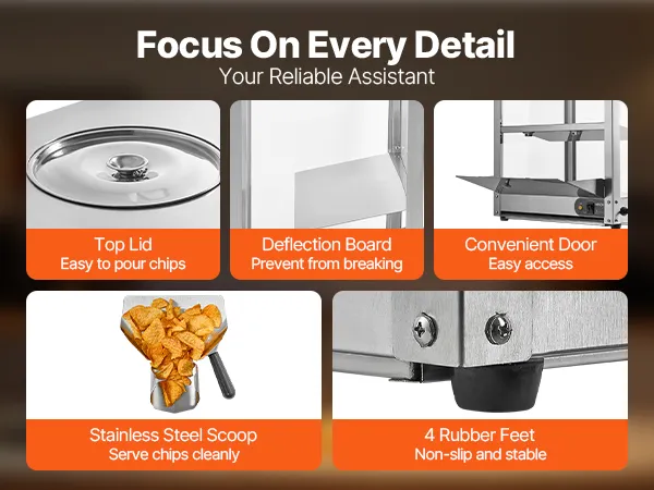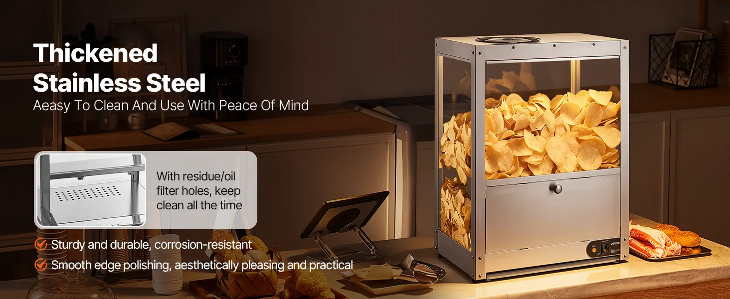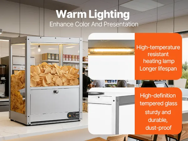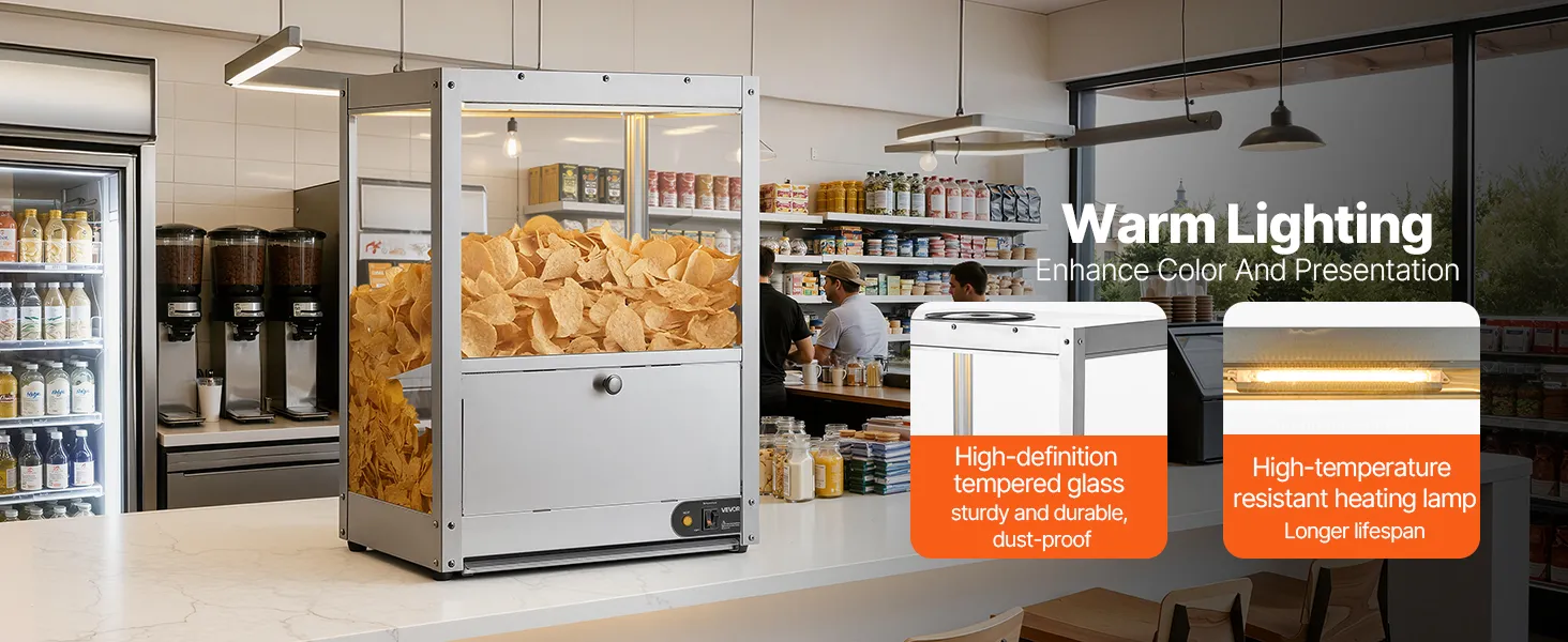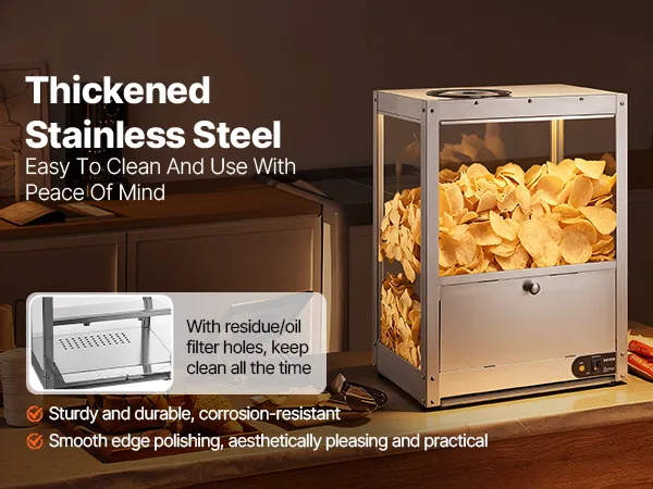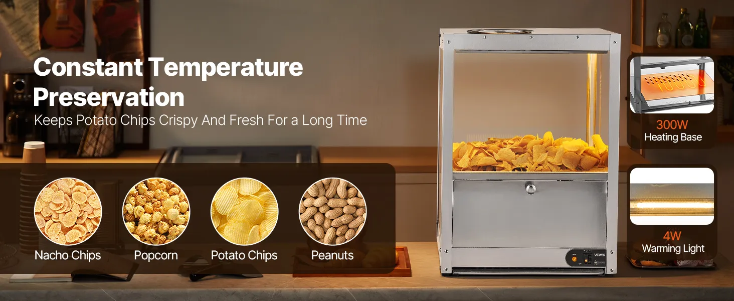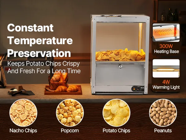 • Keep Warm and Crispy: With a 300W heating base and a 60W heating lamp, this unit effectively dehumidifies and maintains crispy, keeping nacho chips, popcorn, potato chips, and peanuts delicious and fresh, avoiding dryness and hardness.