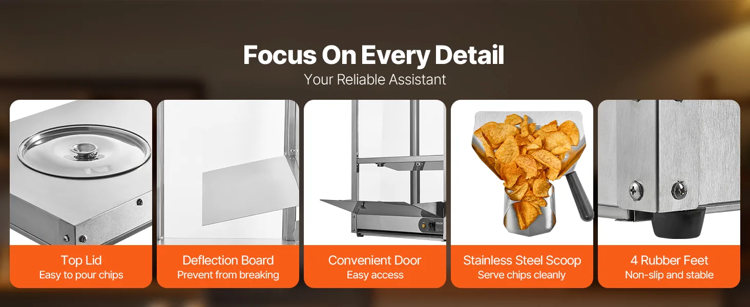 • User-Friendly: Features an easy-to-use control panel, with a deflector plate to prevent chips from breaking. Includes a convenient door and stainless steel shovel for easy serving. The bottom has drainage holes to allow excess oil to flow into a collection tray, making cleaning simple.