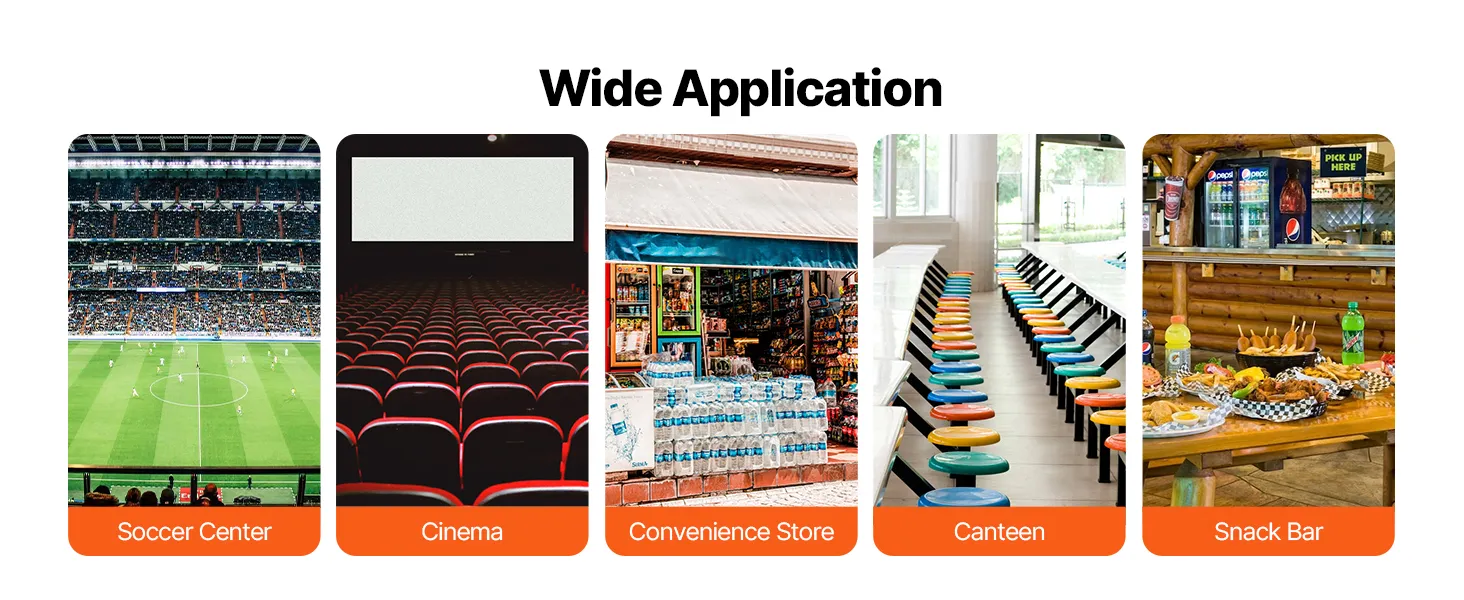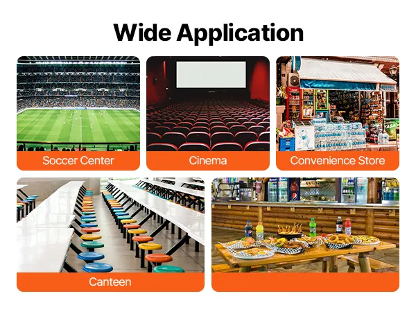 • High Durability: Constructed with sturdy stainless steel that is rust and corrosion-resistant, designed for long-term use. The safety tempered glass is easy to clean and provides peace of mind. Non-slip foot pads at the bottom ensure stability. It’s the perfect choice for stadiums, cinemas, convenience stores, cafeterias, and snack bars.