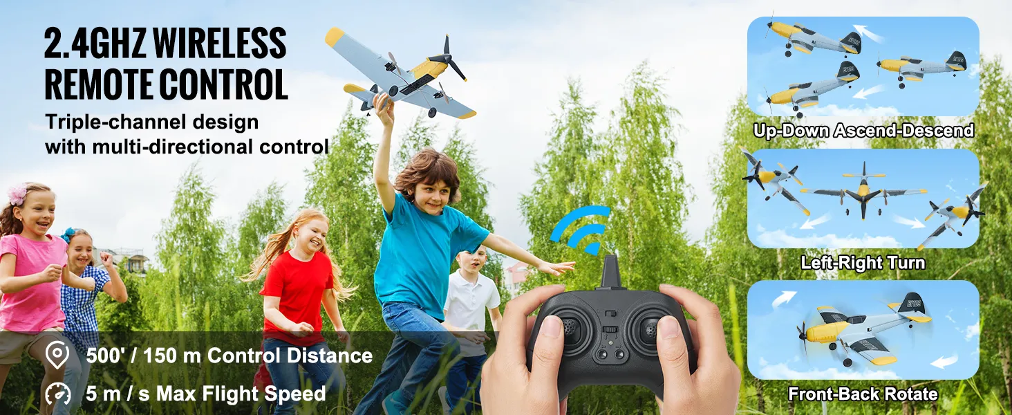 Ons RC-vliegtuig is gemaakt van premium EPP-materiaal. Deze constructie betekent dat het lichtgewicht is, maar toch stevig genoeg om de ontberingen van buitenvliegen aan te kunnen. De sterke constructie verbetert de duurzaamheid, waardoor het geschikt is voor verschillende buitenomstandigheden. Het maakt niet uit of u in het park, op het strand of in uw achtertuin vliegt, ons 2,4 GHz-vliegtuig met afstandsbediening kan al die elementen aan. U kunt dus vol vertrouwen blijven vliegen.