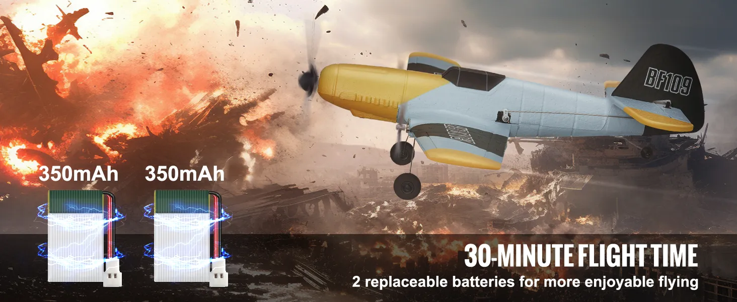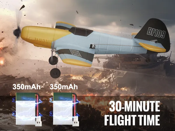 Geniet tot 30 minuten ononderbroken vliegplezier met ons RC-vliegtuig. Uitgerust met twee sets van 350mAh-batterijen, kunt u de lege batterij eenvoudig vervangen door de tweede set voor continu vliegen. Zeg vaarwel tegen lange oplaadtijden en hallo tegen meer tijd in de lucht. Deze functie is perfect voor degenen die van uitgebreide vliegsessies houden en het maximale uit hun RC-vliegtuigervaring willen halen.
