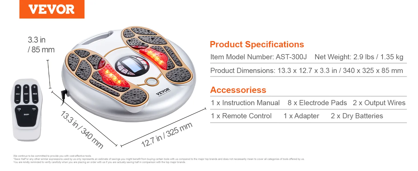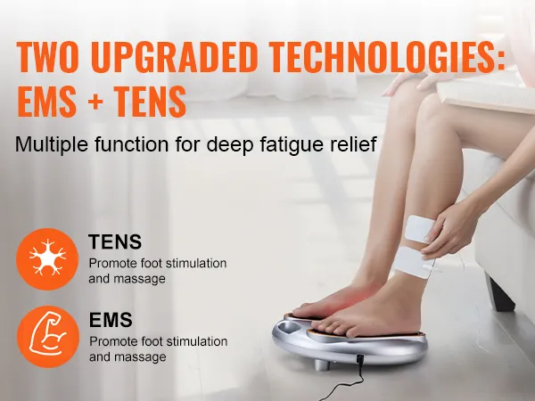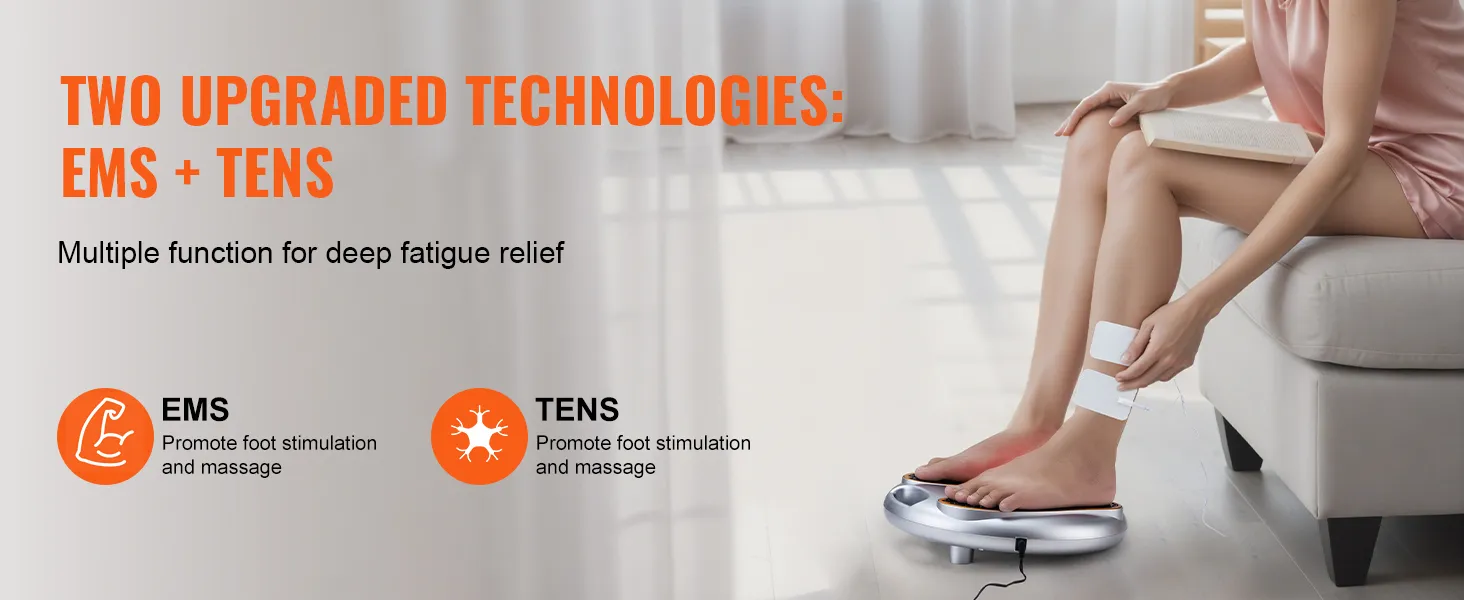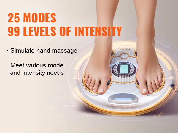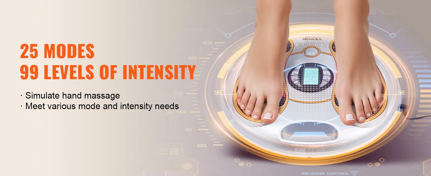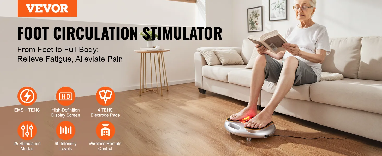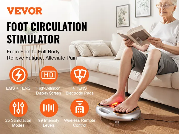VEVOR foot circulation stimulator combines EMS + TENS dual tech to deeply stimulate foot nerves, relax muscles, and promote blood circulation. 25 modes and 99 intensity levels allow you to easily select the ideal massage experience, enjoying professional-grade massage right at home!
