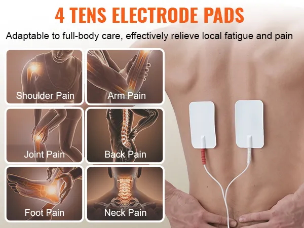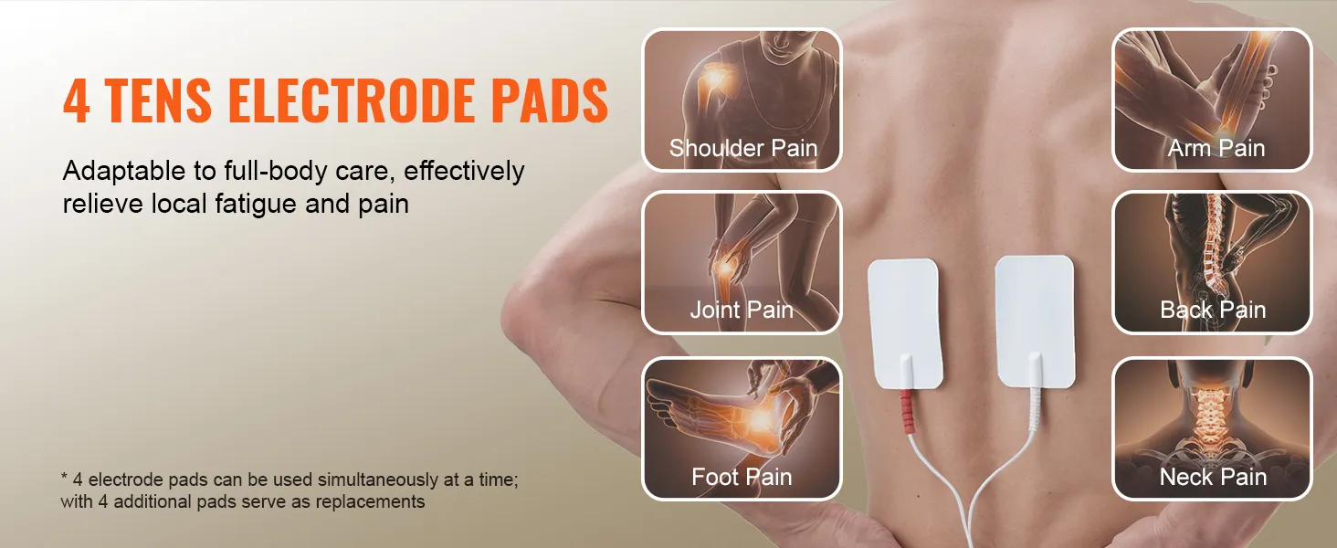 Full-Body Relief: Whether you're dealing with shoulder pain, arm pain, joint pain, lower back pain, foot pain, or neck pain, this electric foot stimulator provides comprehensive relief. The included 4 + 4 TENS electrode pads can be applied to various body parts. (Note: 4 electrode pads can be used simultaneously at a time; with 4 additional pads serve as replacements.)