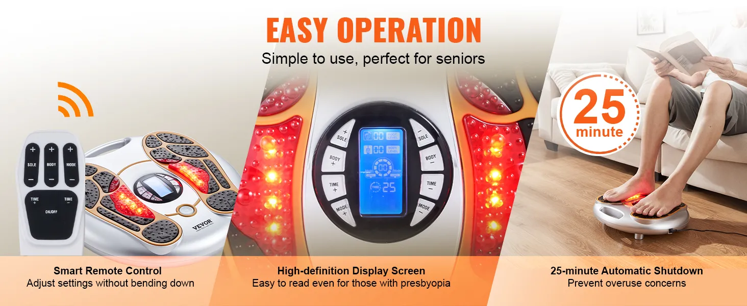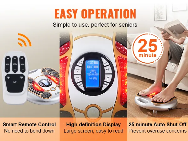 Easy to Operate: Our EMS & TENS foot circulation stimulator offers a user-friendly experience. Equipped with a smart remote control, you can adjust settings without bending down. The high-definition display clearly shows the current settings, and the 25-minute automatic shutdown feature eliminates worries about overuse.