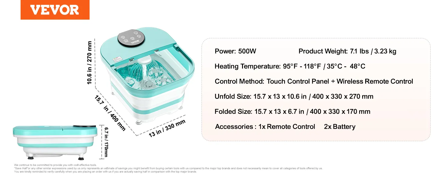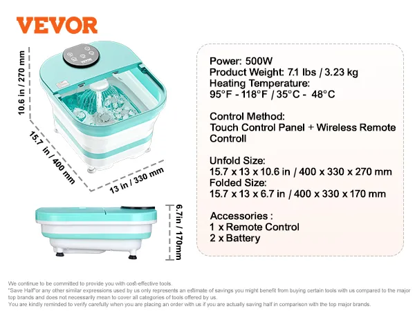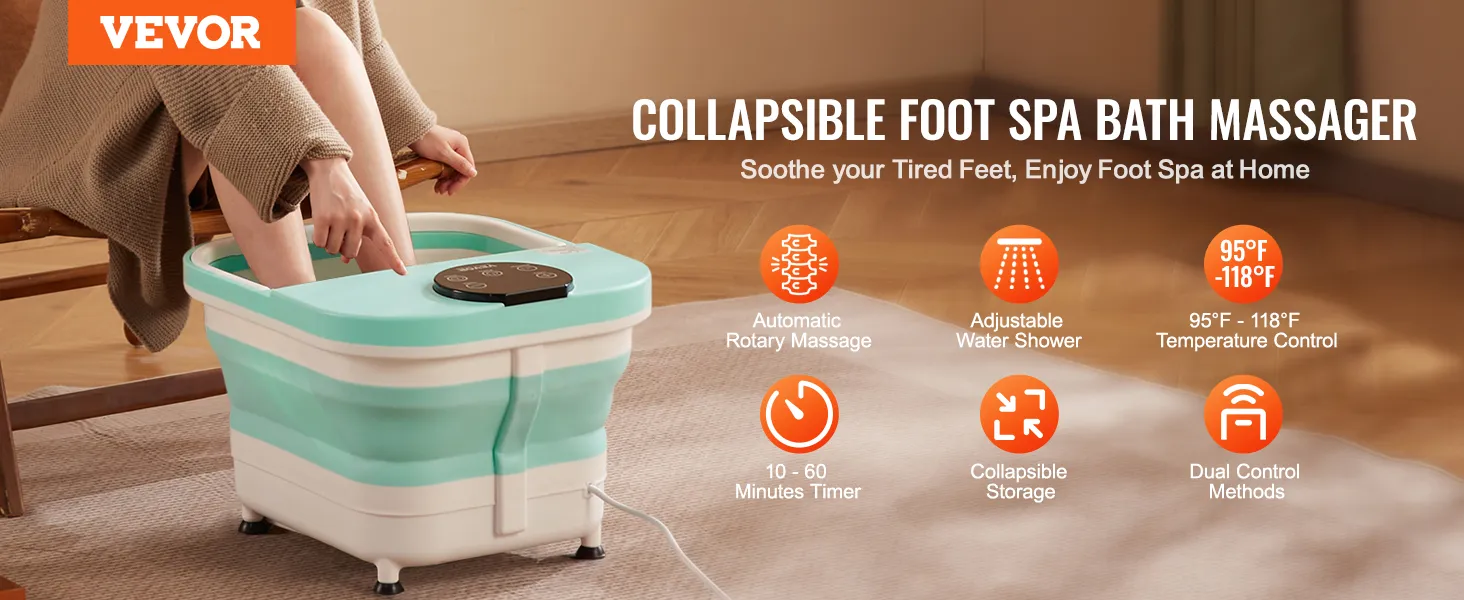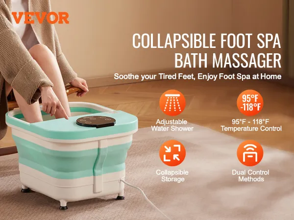 VEVOR collapsible foot spa bath massager features automatic roller massage, adjustable water shower, 95°F - 118°F temperature, 10-60 minute timer, and leak-proof electrical protection to provide the perfect foot therapy experience at home. Enjoy deep feet relaxation and comfort with VEVOR!