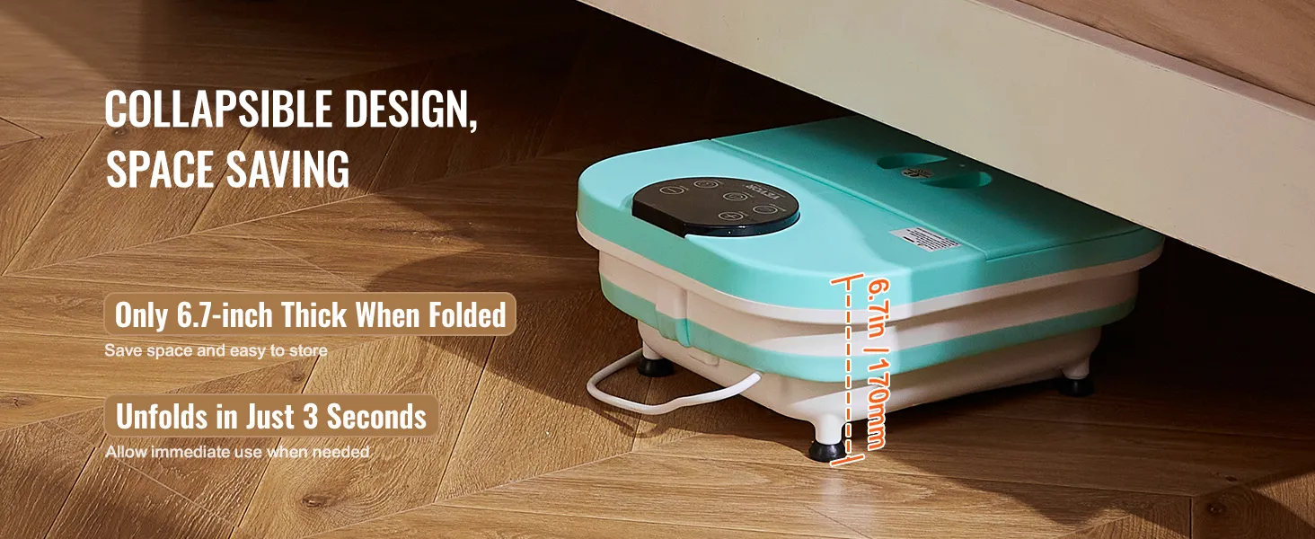 This foot spa tub massager features a collapsible design, which can be easily stored under the sofa, in a cabinet or on a shelf. Let you enjoy foot spa without worrying about occupying too much space. Compact and convenient, it is an ideal choice for home life.
