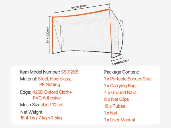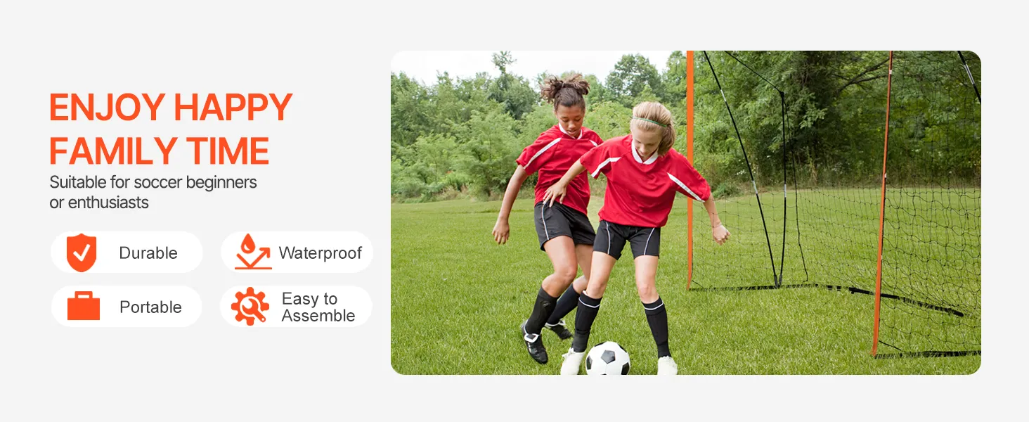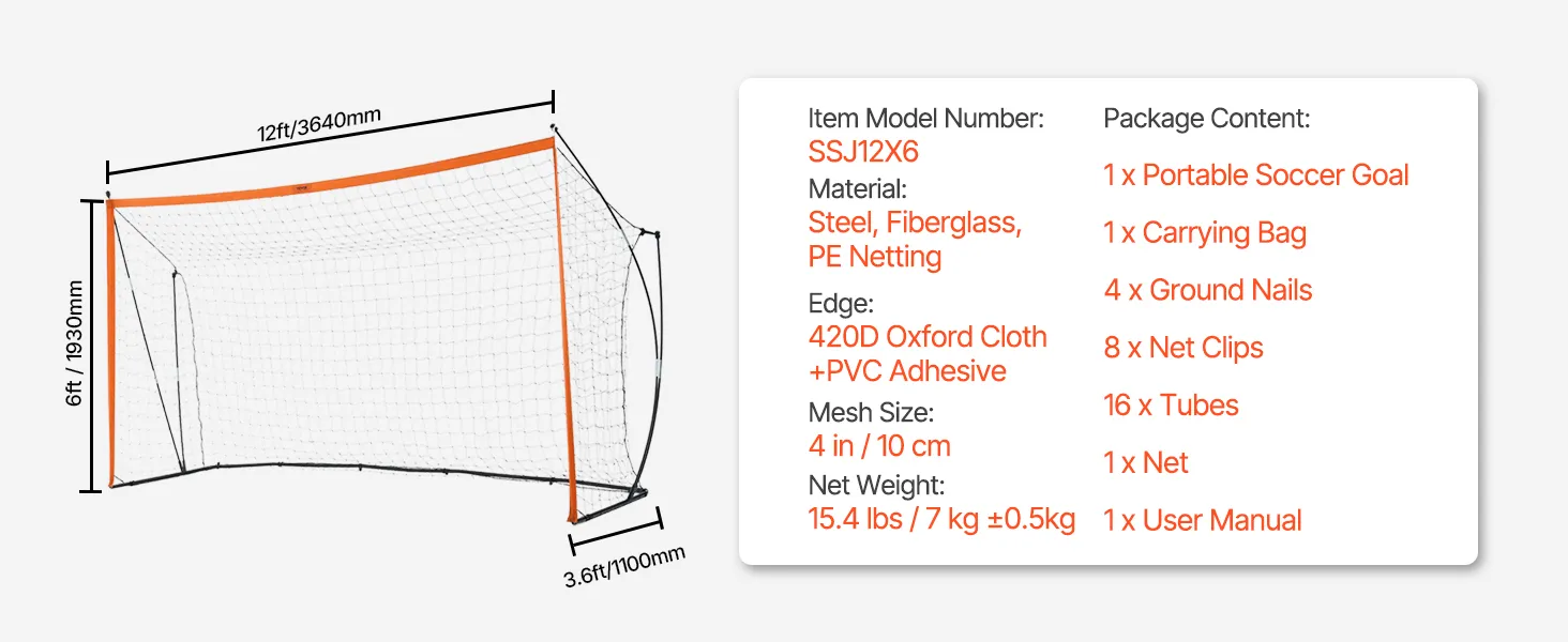 VEVOR Draagbaar voetbaldoelnet 3,66 x 1,83 m voor de tuin, oefenvoetbalnet, trainingsdoelset met stalen en glasvezelconstructie, all-weather voetbaldoelen met draagtas, oranje