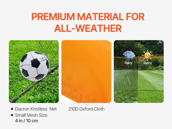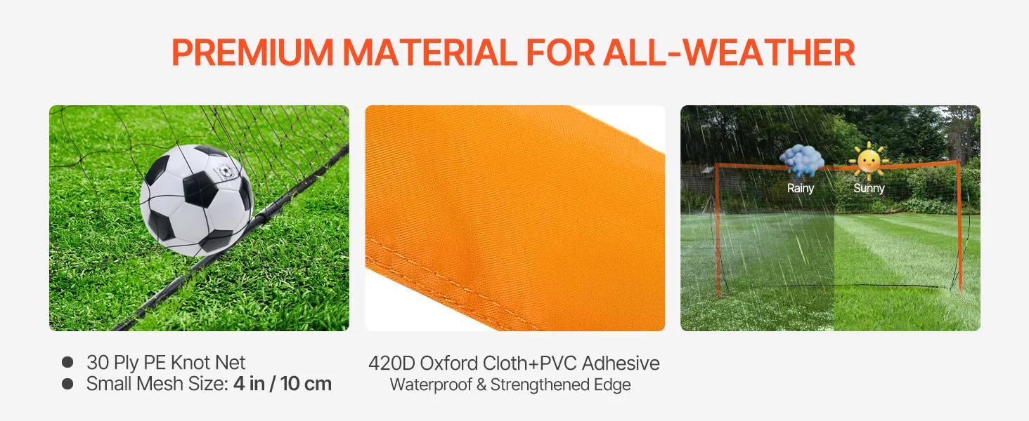 Premium Net: Ons voetbaldoel is voorzien van een hoogwaardig PE-net met een duurzaam 30-laags knoopontwerp. Dit weerbestendige net is niet alleen duurzaam, maar ook versterkt met 420D Oxford-stof en PVC-lijm, waardoor het waterdicht is en de randen verder worden versterkt.
