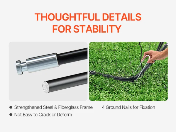 Het voetbalnet bestaat uit een stevig 0,5 inch glasvezelframe aangevuld met stevige stalen componenten. Samen met de zes grondspijkers voor een veilige verankering is er geen risico dat het doel bezwijkt bij intensief gebruik.