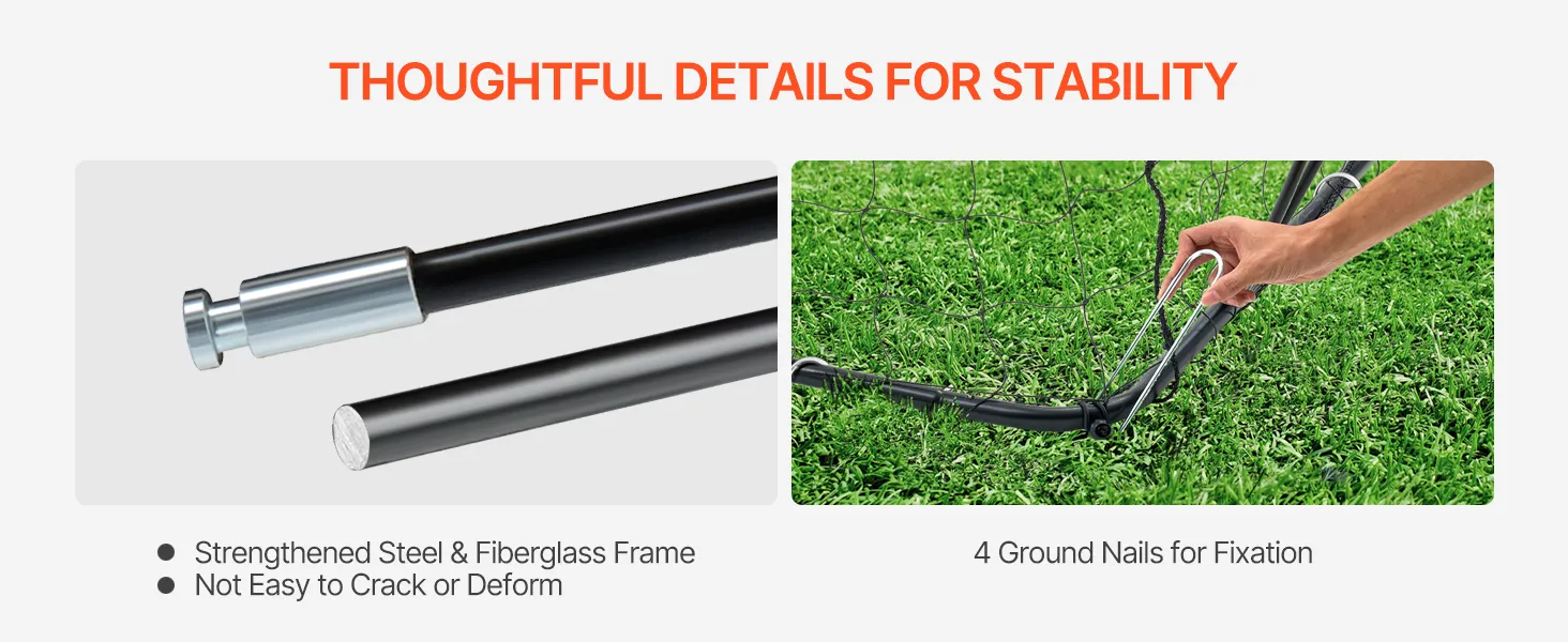 Stalen en glasvezelstructuur: het voetbalnet is voorzien van een stevig 0,5-inch glasvezelframe gecombineerd met stalen componenten voor superieure sterkte en stabiliteit. Dankzij de zes grondspijkers voor een veilige bevestiging bestaat er geen risico dat het doel omvalt bij intensief gebruik.