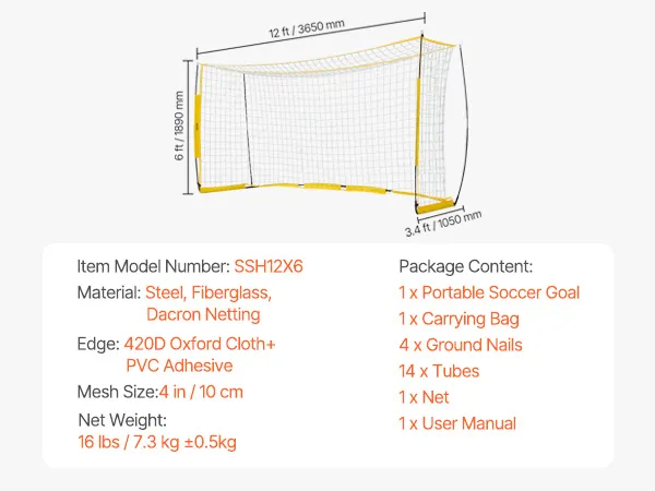 Het voetbalnet bestaat uit een stevig 0,5 inch glasvezelframe aangevuld met stevige stalen componenten. Samen met de zes grondspijkers voor een veilige verankering is er geen risico dat het doel bezwijkt bij intensief gebruik.