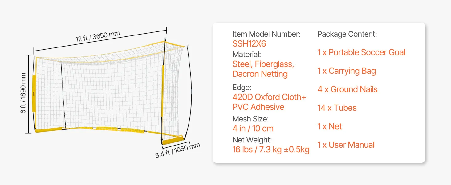VEVOR Draagbaar voetbaldoelnet 3,66 x 1,83 m voor de tuin, groot oefenvoetbalnet, trainingsdoelset met stalen en glasvezelconstructie, all-weather voetbaldoelen met draagtas, geel