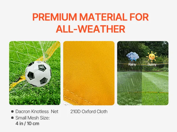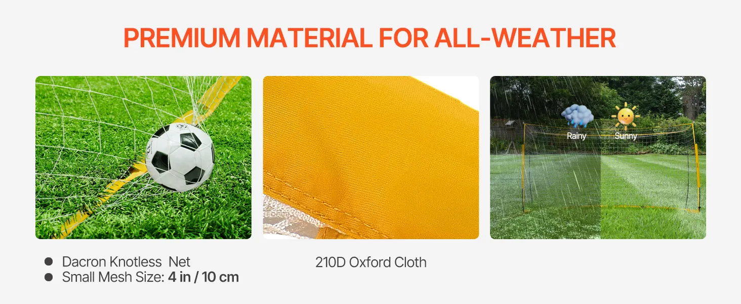 Premium Net: Ons voetbaldoel is uitgerust met een hoogwaardig knooploos Dacron-net. Dit weerbestendige net is niet alleen duurzaam, maar ook versterkt met 210D Oxford-stof, waardoor de randen worden versterkt.