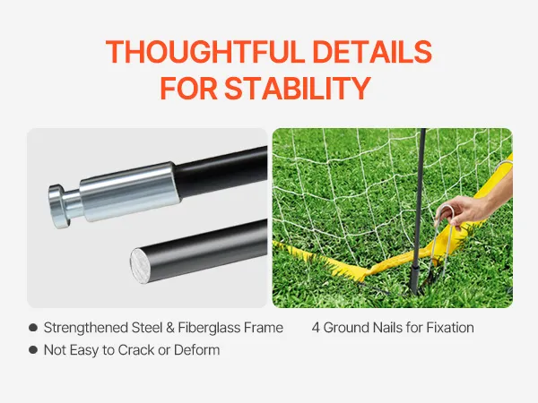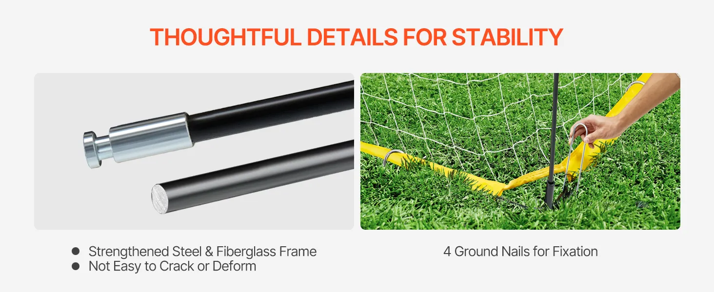 Structuur van staal en glasvezel: het voetbalnet is voorzien van een stevig glasvezelframe van 0,5 inch, gecombineerd met stalen componenten voor superieure sterkte en stabiliteit. Dankzij de zes grondspijkers voor een veilige bevestiging bestaat er geen risico dat het doel omvalt bij intensief gebruik.