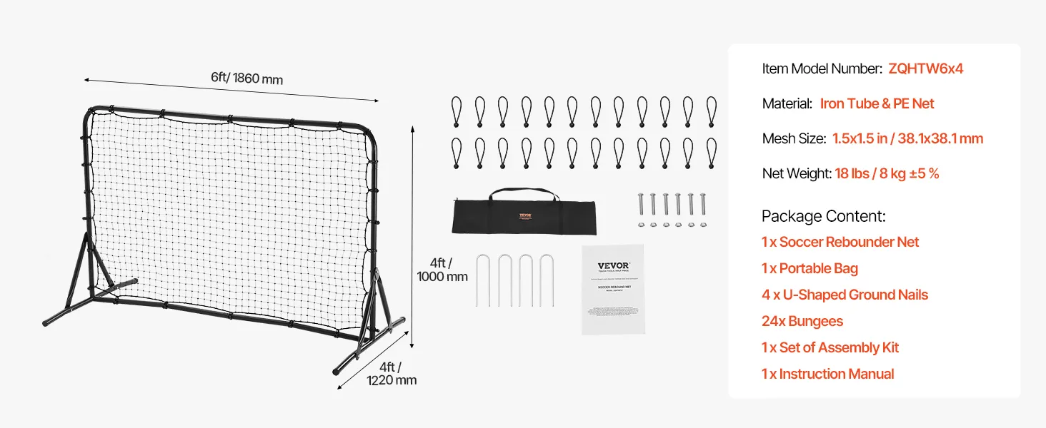 VEVOR Soccer Rebound Net 6 x 4 voet Draagbaar trainingscadeau, dubbelzijdig reboundnet, voetbaltrainingsapparatuur, hulpmiddelen en uitrusting voor alle leeftijden Kick-Back Rebounder