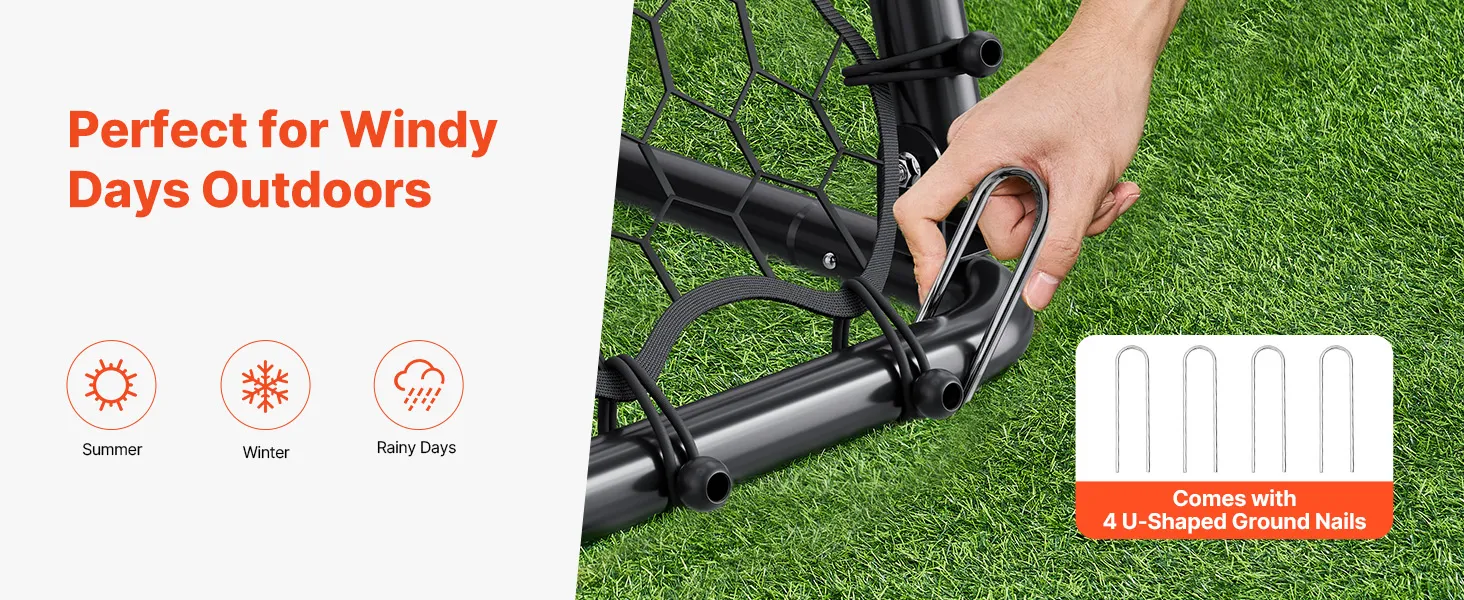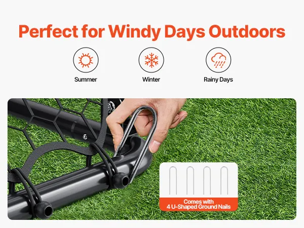 Stabiliteit voor succes: het voetbaltrainingsapparaat bevat 4 U-vormige grondspijkers. Hoe intens je training ook wordt, de mesh blijft stabiel en biedt een betrouwbaar platform om je vaardigheden te verbeteren.