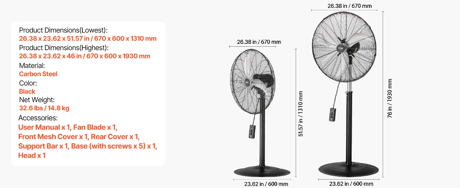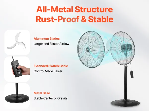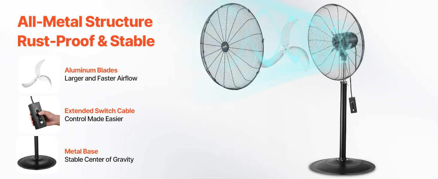 High-Quality Motor: Our industrial pedestal fan is equipped with an industrial-grade PSC motor with thermal protection, ensuring efficient airflow output while maintaining motor stability. It features a thermal protection mode that automatically activates power-off protection when prolonged use causes overheating