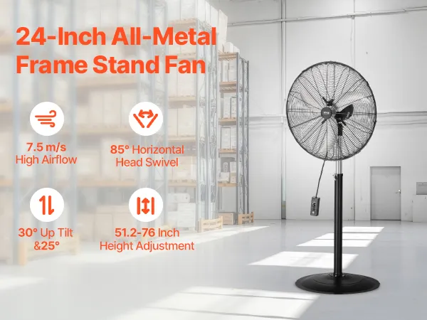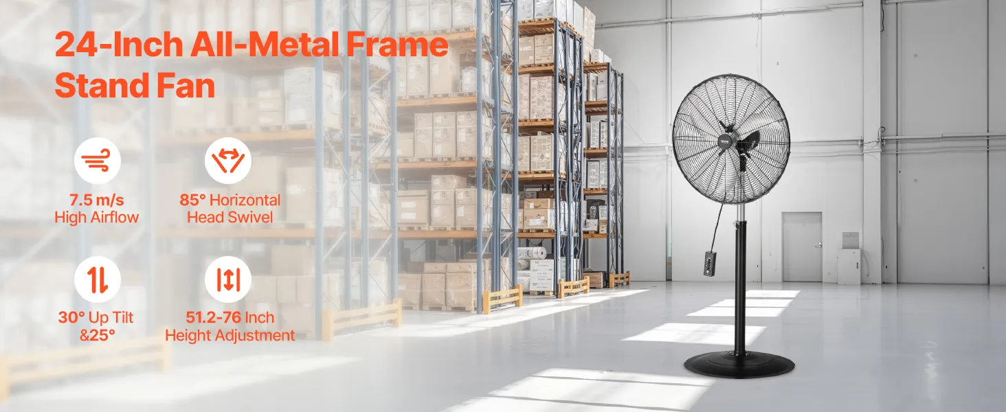 VEVOR Industrial Pedestal Fan, 24 Inch 85-Degree Oscillating Fan, Height Adjustable Standing Fans with 3 Adjustable Speeds, High Power Floor Fans for Bedroom, Living Room, Home, Office, Black