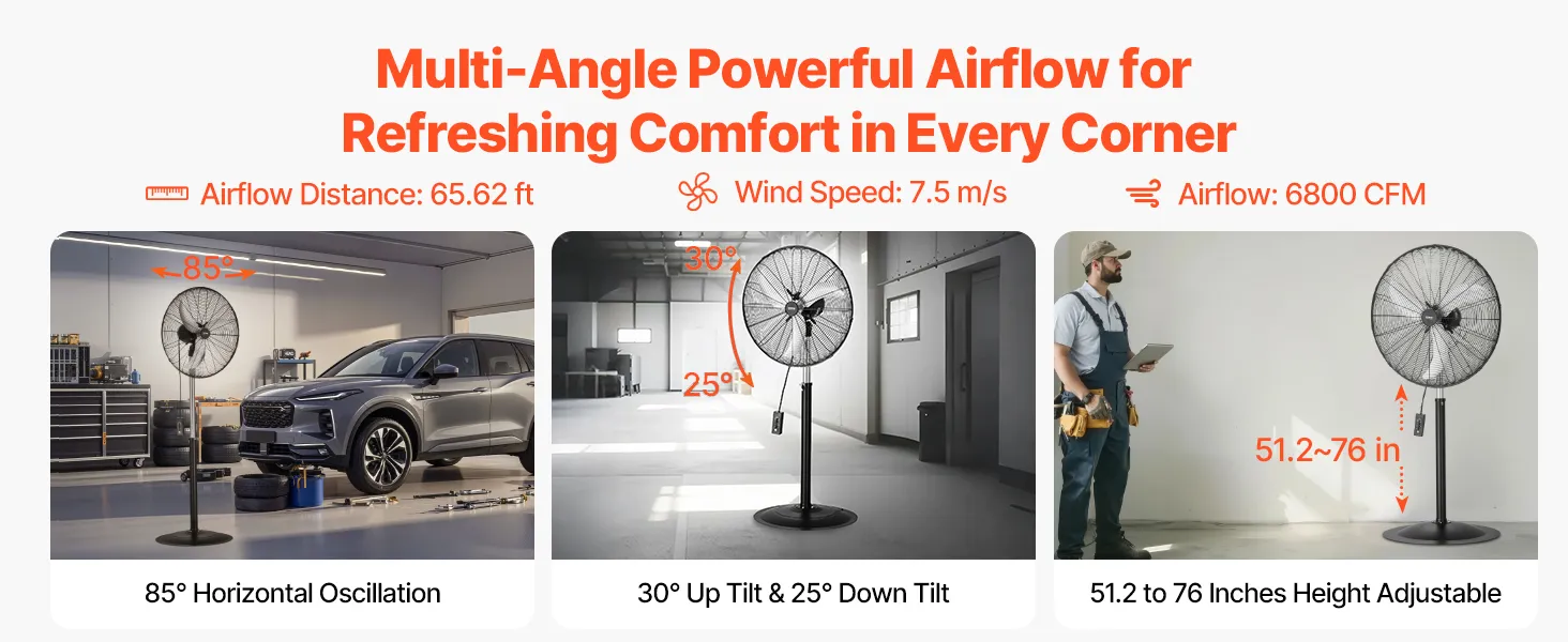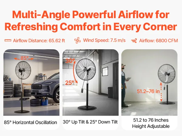 65.62 ft Air Delivery Distance: Equipped with 30° upward tilt and 25° downward tilt manual angle adjustments, along with a 85° wide-angle automatic oscillation, this fan ensures a refreshing breeze reaches every corner of your space, no matter where you are