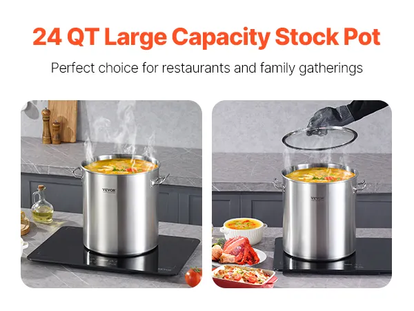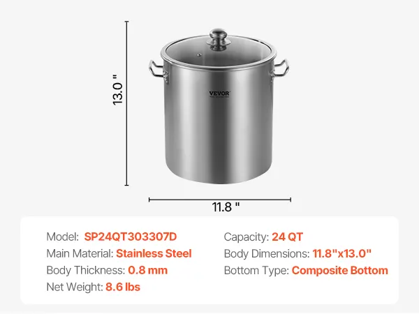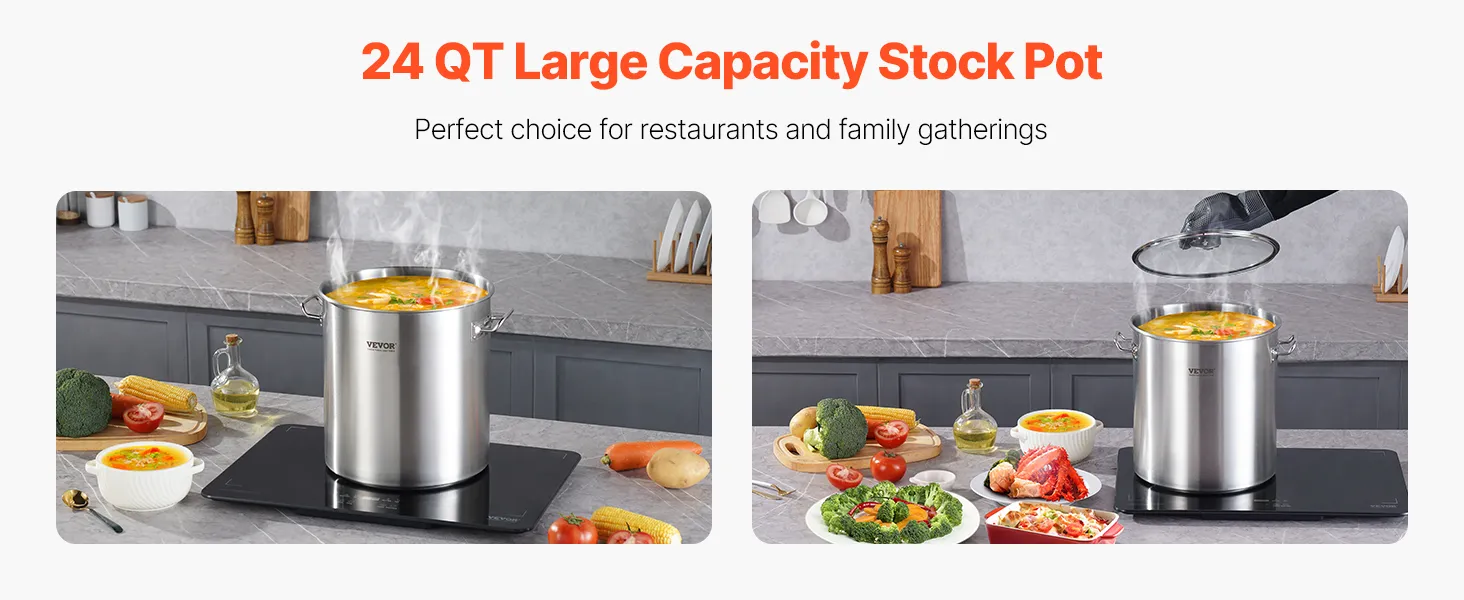 22,7 liter grote capaciteit: de binnenafmetingen van de pot zijn 300 x 330 mm (11,8 x 13,0 inch). Hij kan worden gebruikt voor het stomen van grote kreeften, het braden van kalkoenen, het koken van soepen, ovenschotels en meer, waardoor hij geschikt is voor restaurantkeukens en gezinnen die regelmatig bijeenkomsten organiseren.