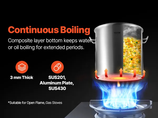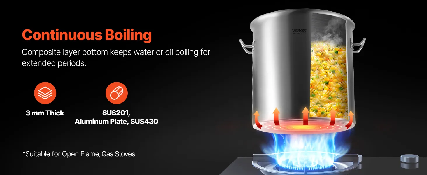 Composietbodem met gelijkmatige warmteverdeling: De bodem van de stevige soeppan is 3 mm dik en kan gebruikt worden op open vuur, inductiekookplaten en gasfornuizen. Het zorgt voor een gelijkmatige warmte en langdurig koken, zodat het voedsel goed gaar wordt.