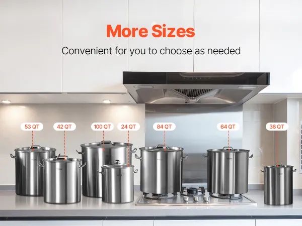 Andere maten: Het volledige assortiment roestvrijstalen kookpannen omvat 7 maten om uit te kiezen (24QT/22,7L, 36QT/34L, 42QT/39,7L, 53QT/50,1L, 64QT/60.5L, 84QT / 79,5L, 100QT / 94,6L). U kunt het formaat van uw voorkeur kiezen op basis van het aantal gezinsleden of uw kookbehoeften.