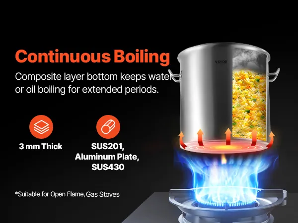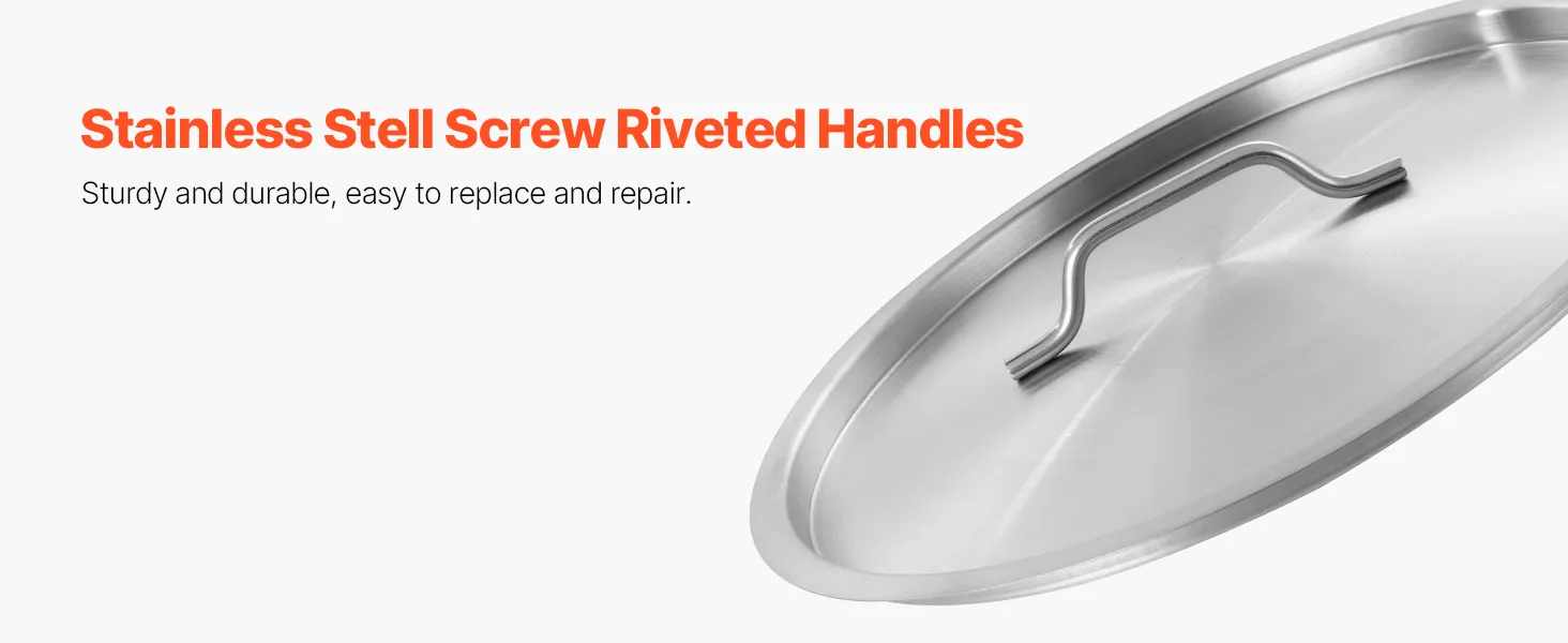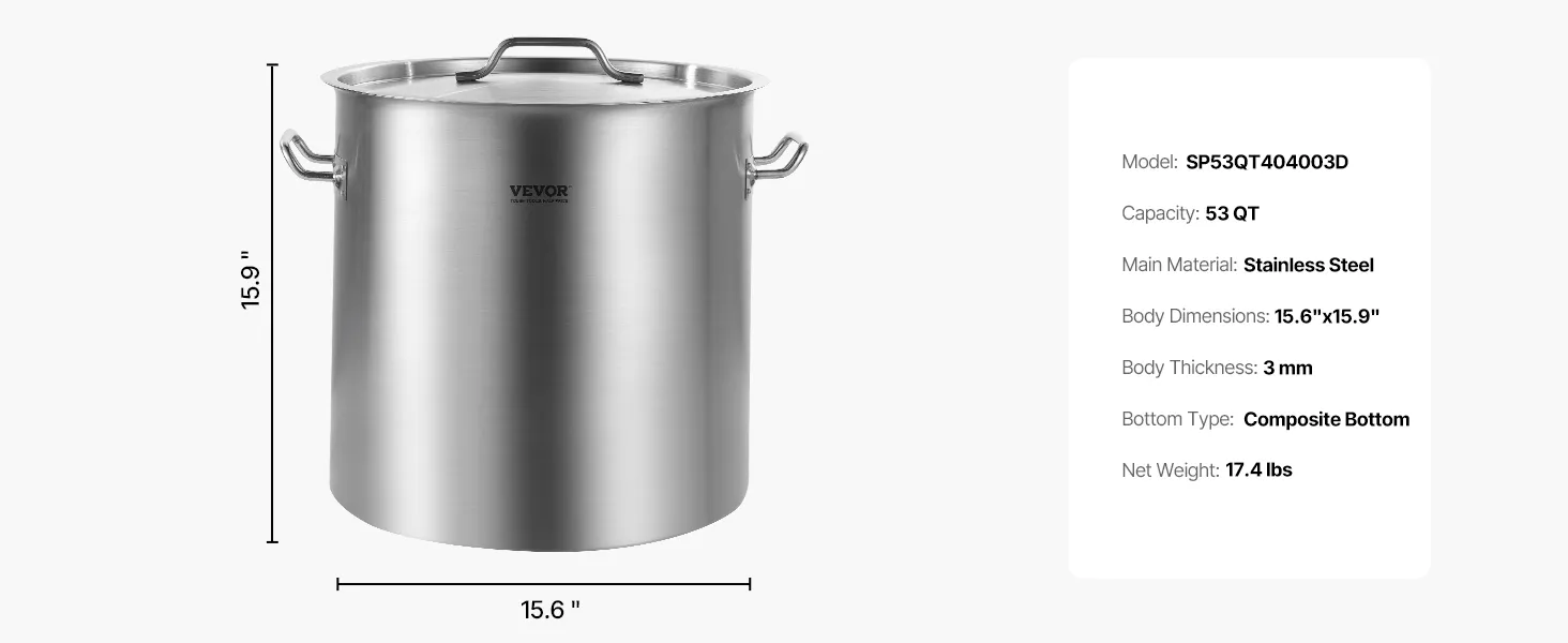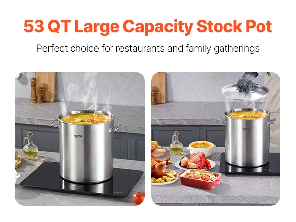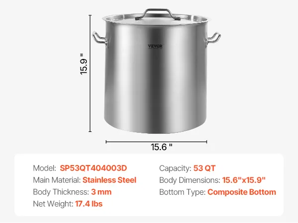 Andere maten: Het volledige assortiment roestvrijstalen kookpannen omvat 7 maten om uit te kiezen (24QT/22,7L, 36QT/34L, 42QT/39,7L, 53QT/50,1L, 64QT/60.5L, 84QT / 79,5L, 100QT / 94,6L). U kunt het formaat van uw voorkeur kiezen op basis van het aantal gezinsleden of uw kookbehoeften.