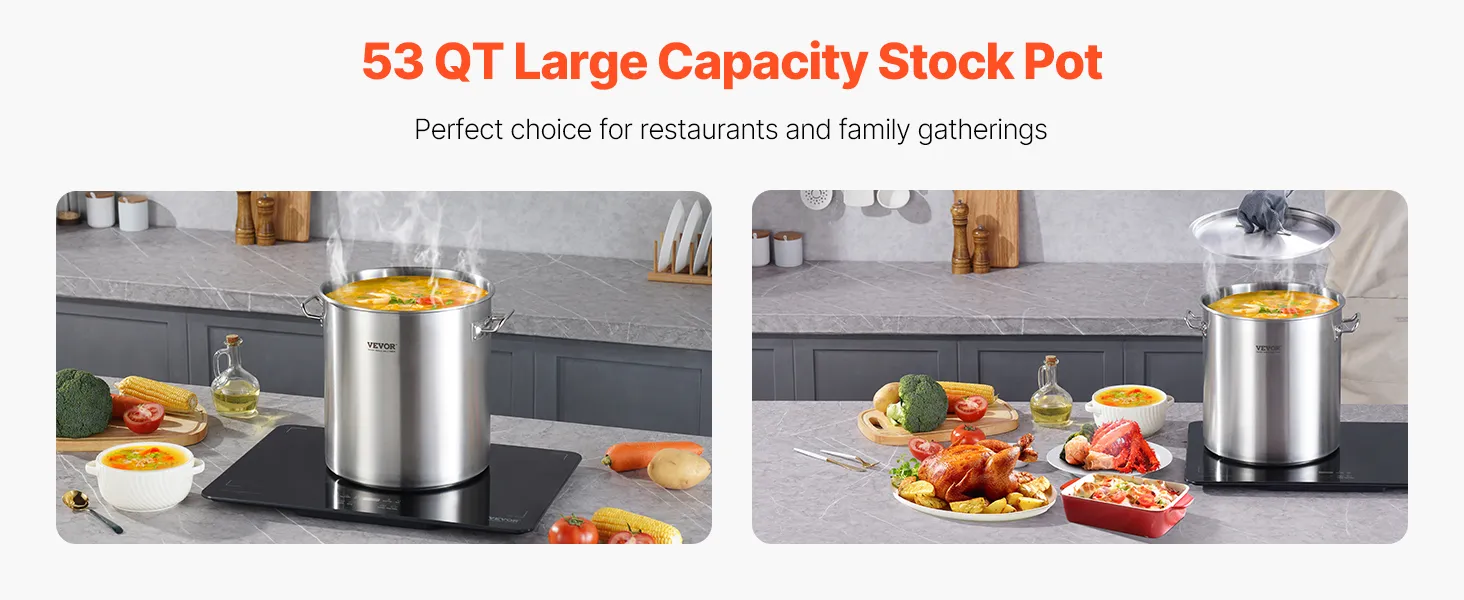 50,1 l grote capaciteit: de binnenafmetingen van de pot zijn 395 x 405 mm (15,6 x 15,9 inch). Hij kan worden gebruikt voor het stomen van grote kreeften, het braden van kalkoenen, het koken van soepen, ovenschotels en meer, waardoor hij geschikt is voor restaurantkeukens en gezinnen die regelmatig bijeenkomsten organiseren.