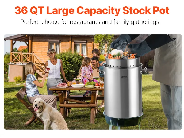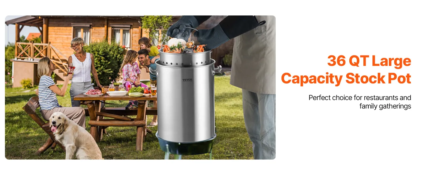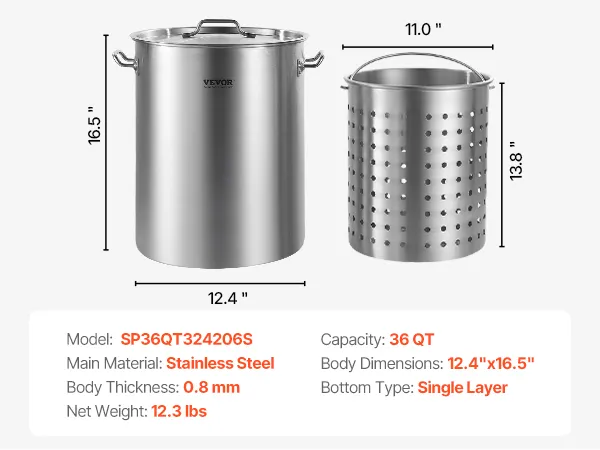 36 QT / 34 L Large Capacity: The internal dimensions of the pot are 12.4" x 16.5" / 315 x 420 mm. It can be used for steaming large lobsters, frying turkeys, boiling soups, stewing dishes, and more, making it suitable for restaurant kitchens and families that frequently host gatherings.