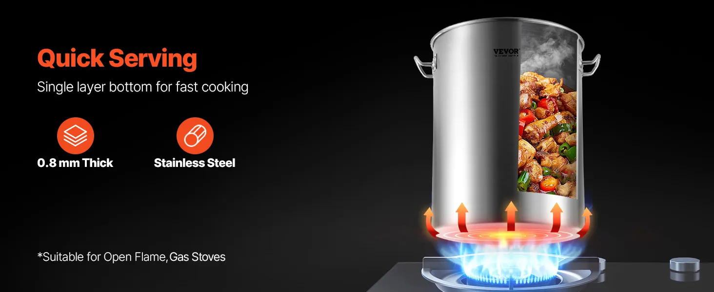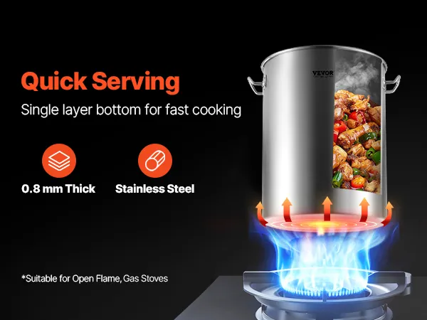 Quick Heat Transfer Single-Layer Bottom: The heavy duty stock pot's bottom thickness is 0.8 mm and can be used on open flames and gas stoves. The pot enhances cooking efficiency through quick heat transfer, saving you precious time.