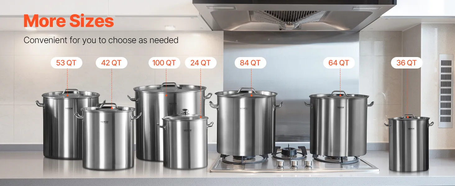 More Sizes: The full range of stainless steel stockpot cookwares includes 7 sizes for you to choose from (24 QT / 22.7 L, 36 QT / 34 L, 42 QT / 39.7 L, 53 QT / 50.1 L, 64 QT / 60.5 L, 84 QT / 79.5 L, 100 QT / 94.6 L). You can select your preferred size based on the number of family members or your cooking needs.