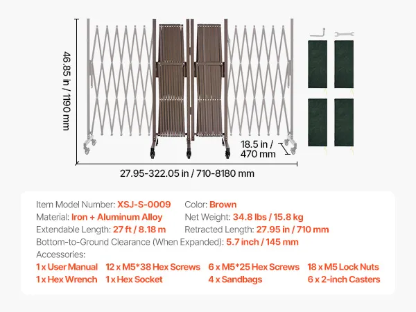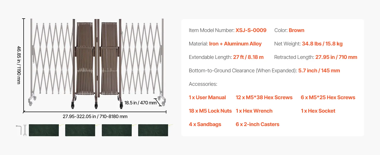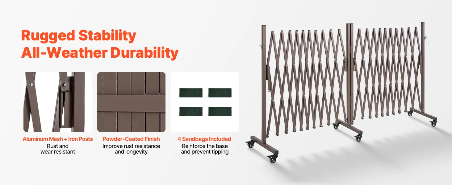 Gebieden afschermen: Met de dubbele uitschuifbare schaarhekken van VEVOR kunt u snel een grote veiligheidsbarrière plaatsen om gevaren in te dammen en de omgeving te beschermen. Uitgeschoven lengte: 8,18 m (27 ft), ingeschoven lengte: 710 mm (27,95 in), hoogte: 1190 mm (47 in)