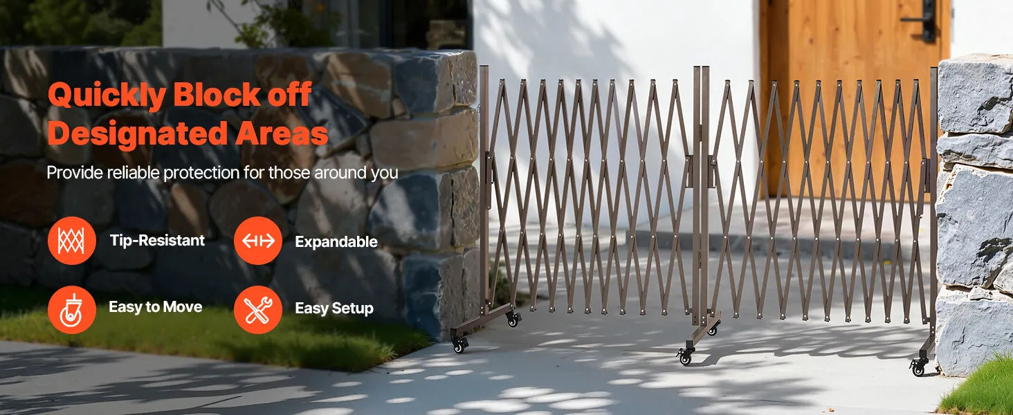 VEVOR Uitschuifbare schaarpoort, dubbele barrière met vergrendelbare wielen, 8,18 m verstelbaar, mobiele beschermingsbarrière voor waarschuwingseffect, metalen barricade voor buiten- en industrieel gebruik