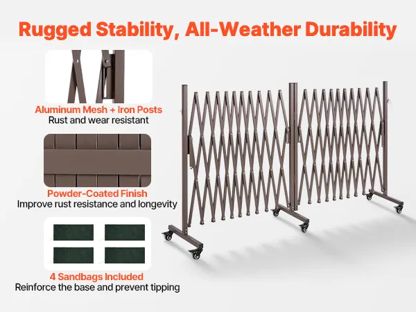 Robuust en duurzaam: onze uitschuifbare veiligheidsbarrières zijn gemaakt van aluminium gaas en ijzeren palen met een poedercoating voor een lange levensduur. Vier zandzakken worden meegeleverd voor extra stabiliteit en omvallen bij wind en regen.