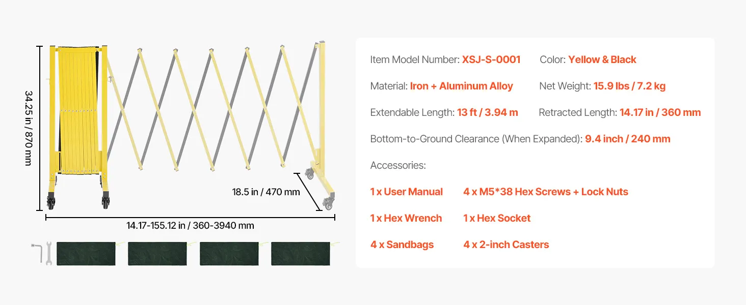 • Gebiedsafscherming: De uitschuifbare VEVOR-barrière maakt een snelle inzet van een veiligheidsbarrière mogelijk om gevaren in te dammen, menigten te leiden en omstanders te beschermen. Uitgeschoven lengte: 3,94 m (13 ft), Ingeschoven lengte: 360 mm (14,17 in), Hoogte: 870 mm (34 in)