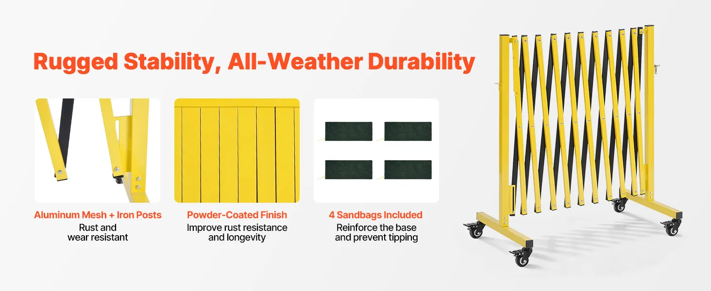 • Robuust en duurzaam: onze uitschuifbare veiligheidsbarrière is gemaakt van aluminium gaas en ijzeren palen met een poedercoating voor een lange levensduur. Vier zandzakken worden meegeleverd voor extra stabiliteit en omvallen bij wind en regen.