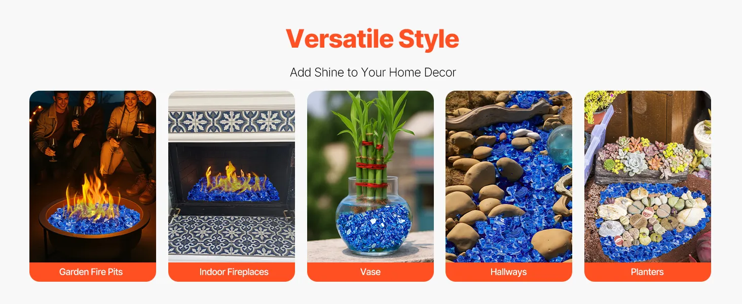Onze kleurrijke decoratieartikelen, gemaakt van hoogwaardig, brandwerend glas, zijn duurzaam en hittebestendig. Ze smelten niet, barsten niet en produceren geen rook of as. Een simpele veeg met een spons herstelt hun glans. Ideaal voor open haarden, schouwen en tuinen, ze geven moeiteloos een vleugje sprankeling aan uw huis.