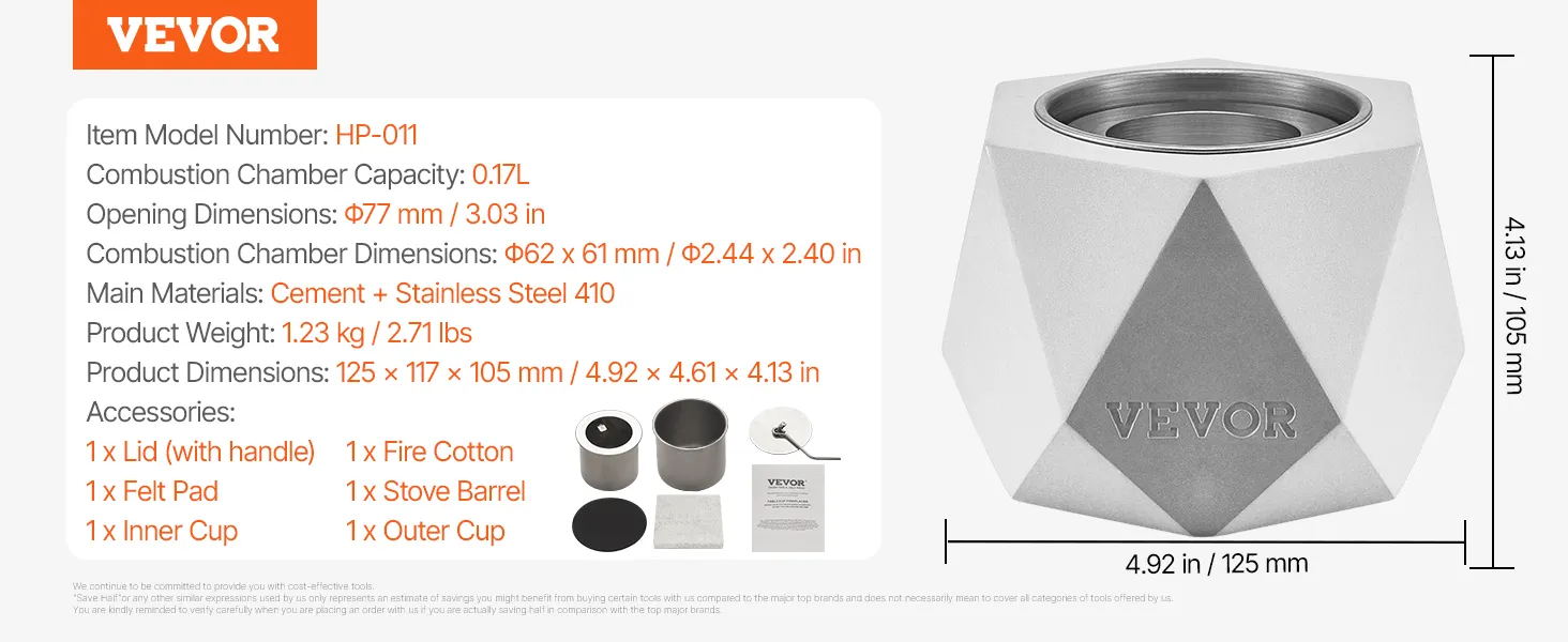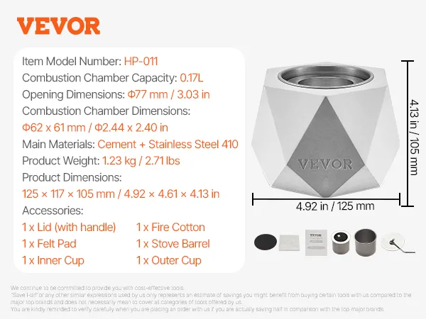 Compact en lichtgewicht: deze tafelvuurplaats meet 125 x 117 x 105 mm / 4,92 x 4,61 x 4,13 inch en weegt slechts 1,23 kg / 2,71 lbs, waardoor hij gemakkelijk te dragen is en perfect geschikt voor gebruik buitenshuis.