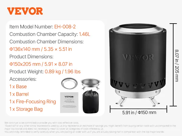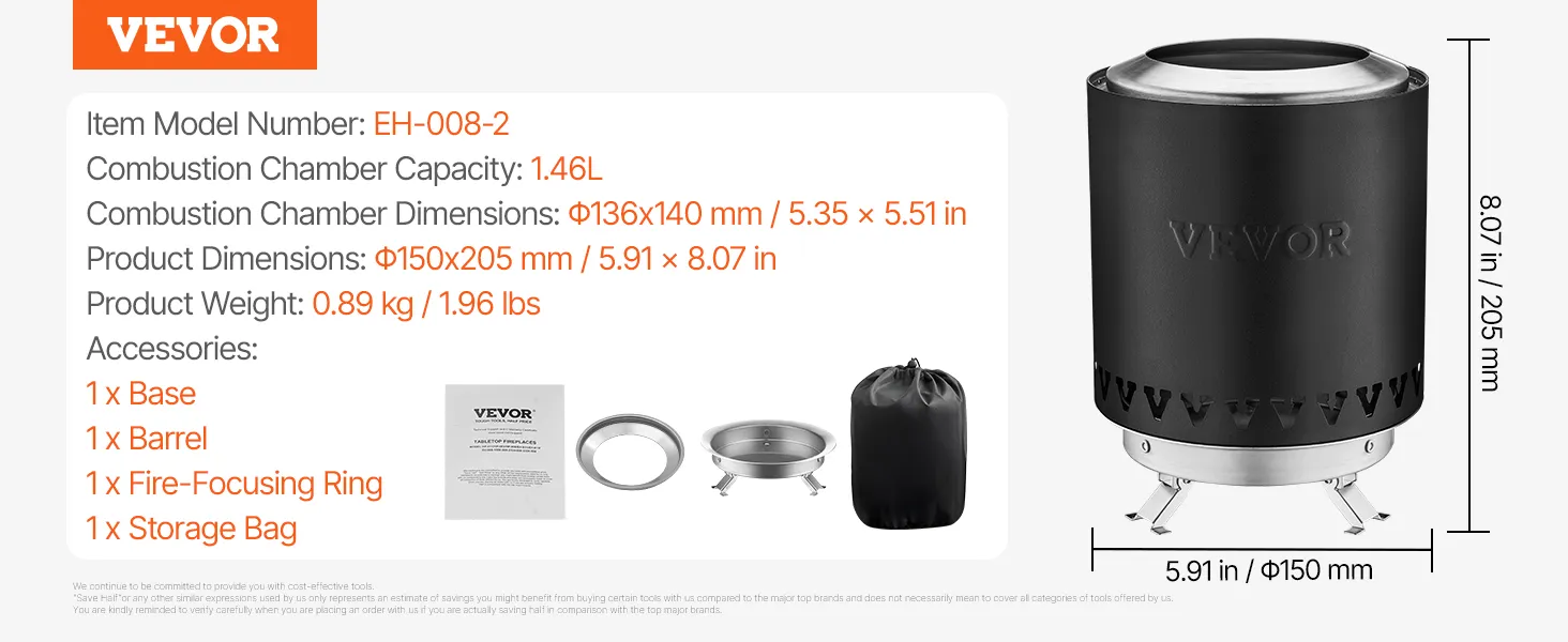 Compact en lichtgewicht: met een compact ontwerp van Φ 5,91 inch x 8,35 inch (15 cm x 21,2 cm) en een gewicht van slechts 1,96 lbs (0,89 kg), wordt deze tafelvuurplaats geleverd met een opbergtas voor eenvoudig transport, waardoor ze perfect zijn voor gebruik buitenshuis.