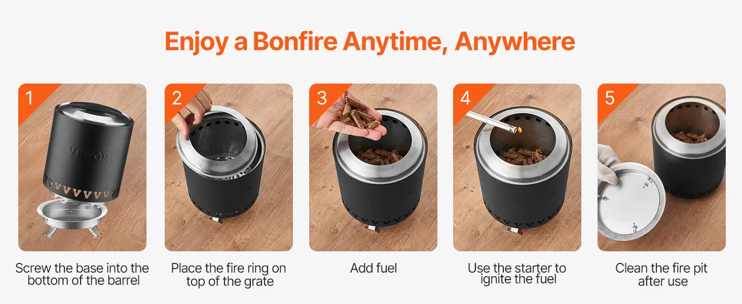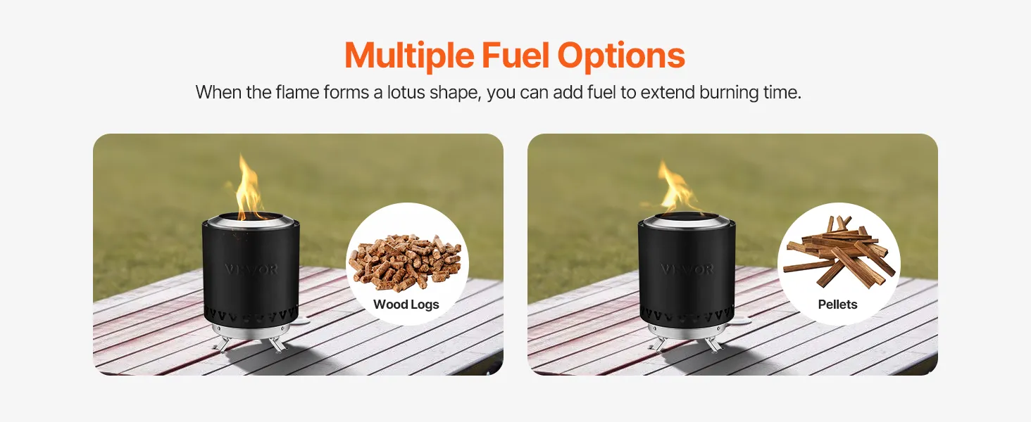 Rookloze haard: de opening van Φ 5,35 inch / 13,6 cm en de vuurring van Φ 3,94 / 10 cm zorgen voor een volledige verbranding, terwijl het geoptimaliseerde ventilatiesysteem de rookuitstoot effectief vermindert en voor een koolstofarme en milieuvriendelijke ervaring zorgt.
