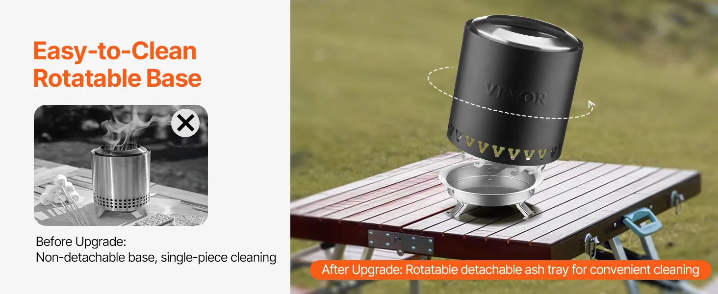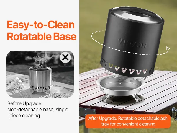 Uitgerust met een draaibare, afneembare voet, is deze tafelhaard gemakkelijk schoon te maken. Verwijder moeiteloos alle brandstofresten en geniet van een comfortabele en schone buitenervaring.