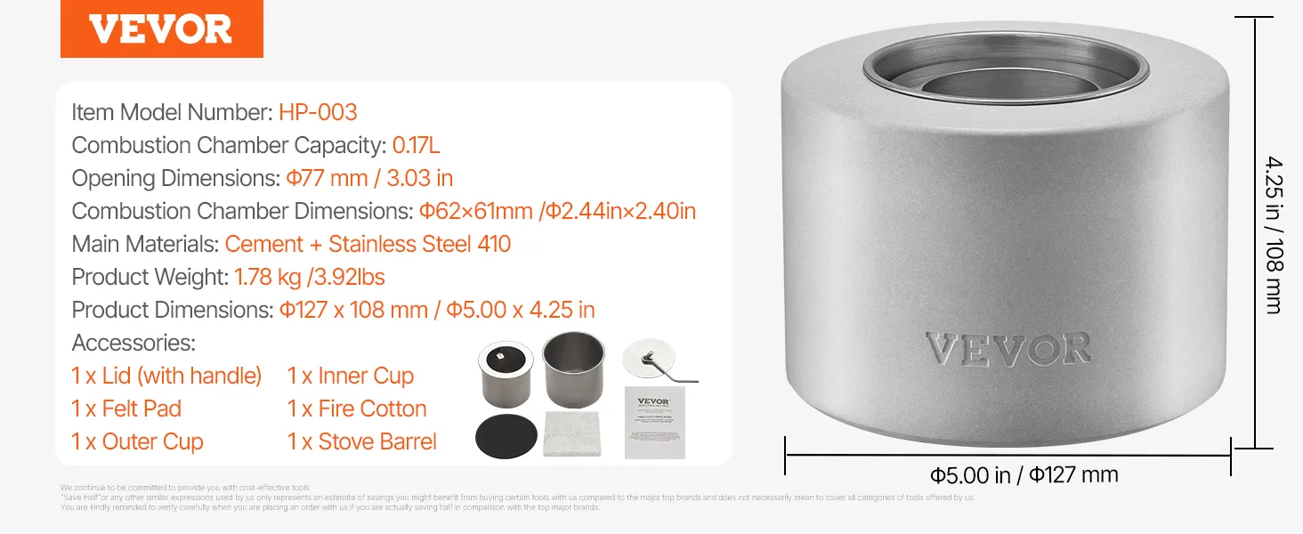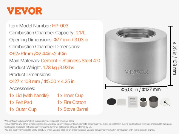 Compact en lichtgewicht: deze tafelvuurplaats heeft een diameter van 5,00 inch x 4,25 inch hoogte (12,7 cm diameter x 10,8 cm hoogte) en weegt slechts 3,92 pond (1,78 kg), waardoor hij gemakkelijk te dragen is en perfect is voor gebruik buitenshuis.