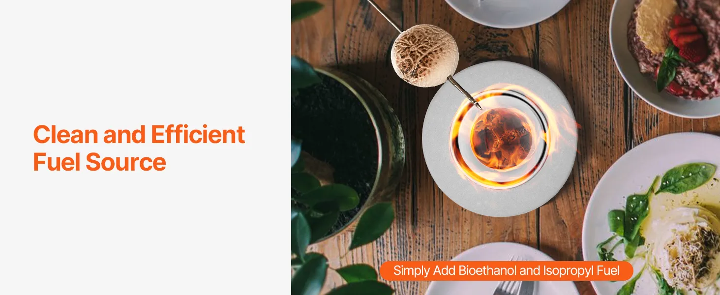 Deze vuurplaats op tafelblad heeft een rookvrij, milieuvriendelijk ontwerp en vereist alleen bio-ethanol of isopropylbrandstof. Het is schoon en veilig, beschermt het milieu en biedt tegelijkertijd een pure, warme ervaring tijdens uw bijeenkomsten.