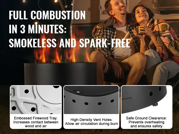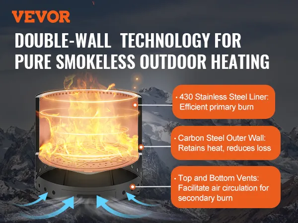 Efficiënte dubbelwandige verbranding met ventilatieopeningen aan de boven- en onderkant bevordert de luchtcirculatie en vermindert de rookontwikkeling. Geniet van de warmte van buitenkamperen zonder het ongemak van rook.