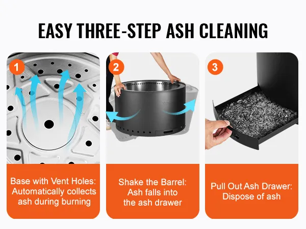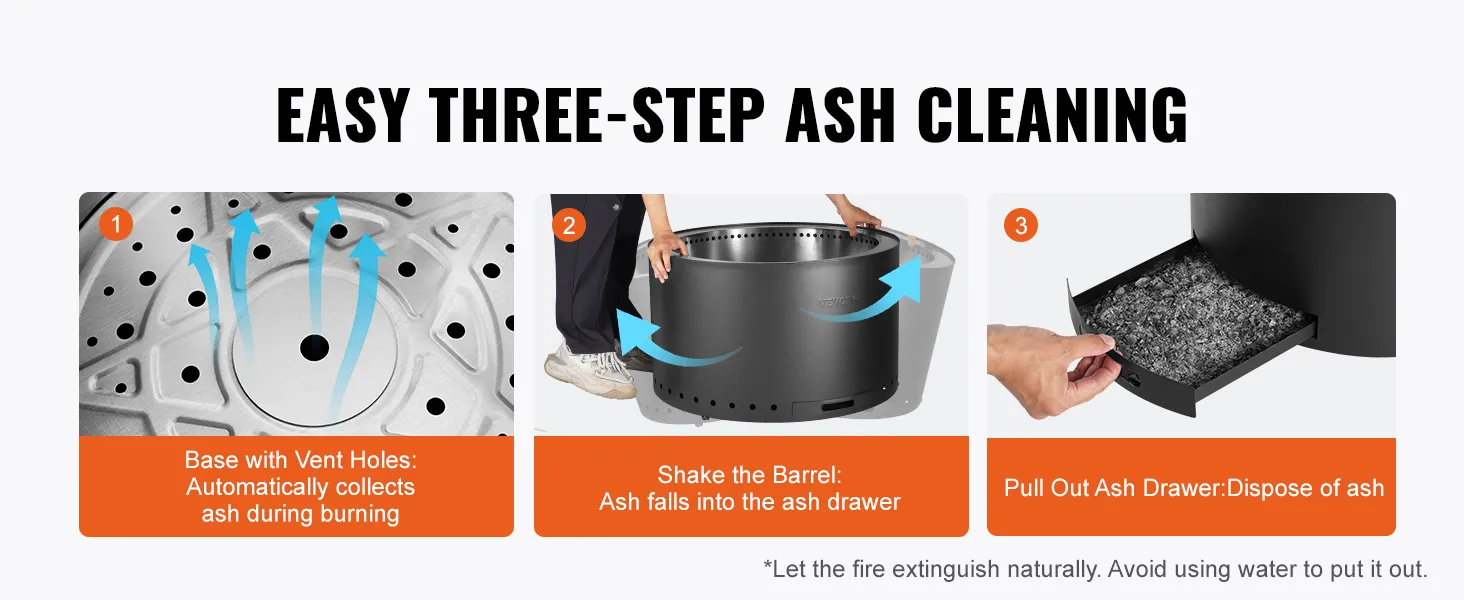 Gemakkelijk as verzamelen: Uitgerust met een uittrekbare asbak voor eenvoudige reiniging, montage en transport. Let op: Na gebruik het vuur op natuurlijke wijze laten doven om roestgevaar te voorkomen door direct met water te blussen.