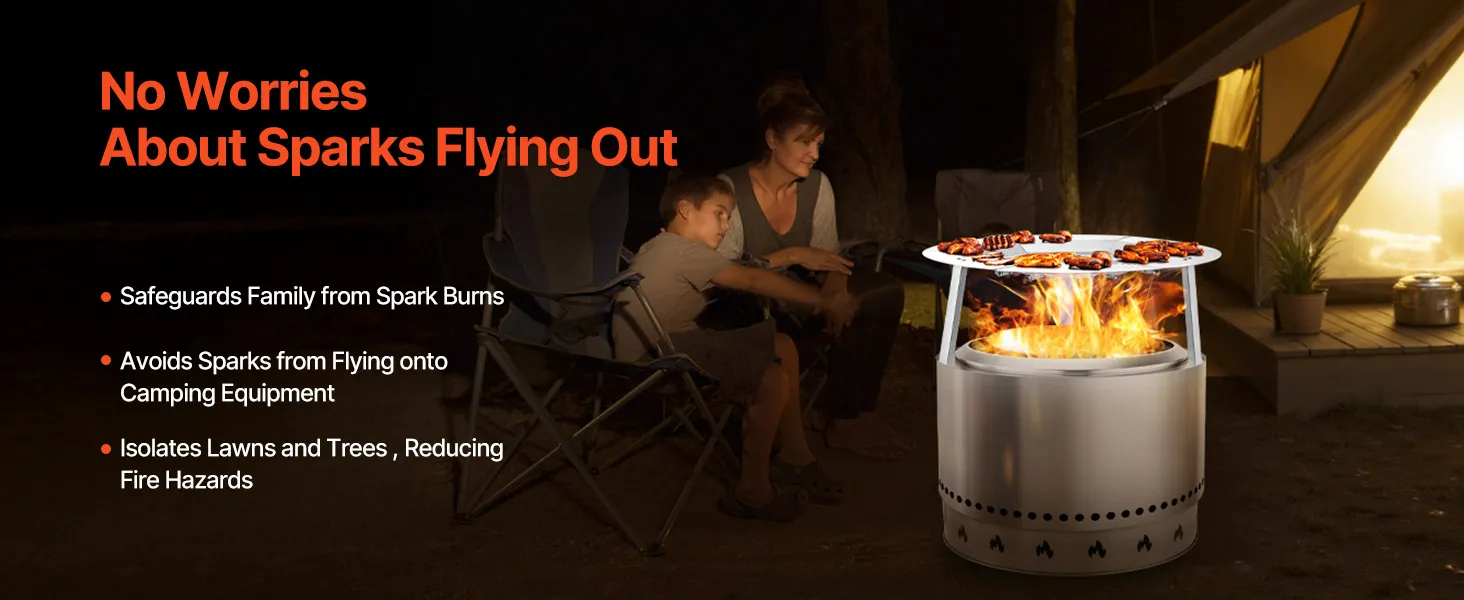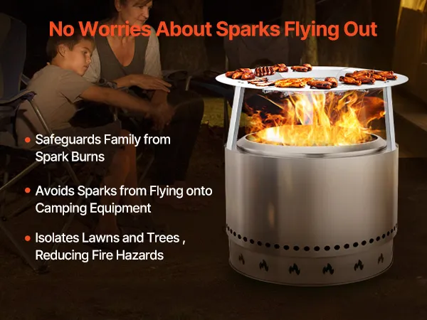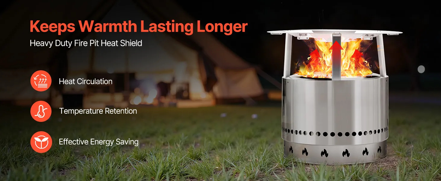 Verbeterde verwarmingsprestaties: ons hitteschild voorkomt verticaal warmteverlies en verdeelt de warmte over een groter oppervlak. Het vermindert het houtverbruik en verlengt de brandduur. Dit maakt uw kampvuur efficiënter, comfortabeler en energiezuiniger.