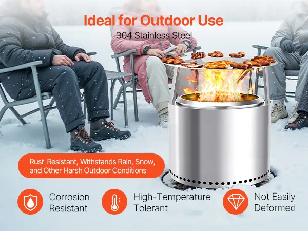 Het hitteschild van de vuurkorf heeft een roestvrijstalen deksel, is hittebestendig en vonkvrij. Hij is geschikt voor grillnetten of aluminium roosters voor het roosteren van marshmallows, zoete aardappelen of kleine stukken vlees. De gelijkmatige warmteverdeling en stevige poten zorgen voor een betrouwbare werking bij het koken in de buitenlucht.