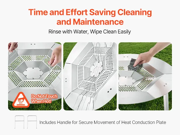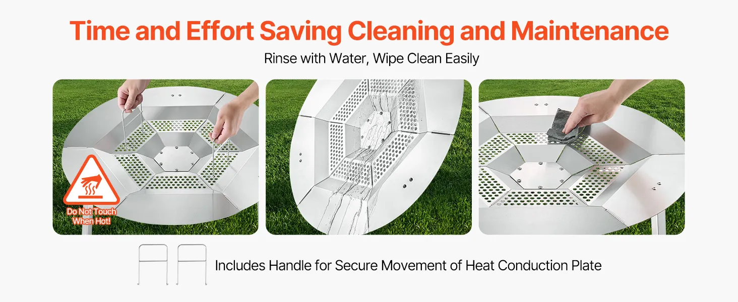 Roestvrij staal 304: Deze warmtegeleider voor kampvuur is gemaakt van roestvrij staal 304 en is duurzaam, hittebestendig en corrosiebestendig. Gladde randen verhogen de veiligheid en zorgen voor stabiliteit, zowel in vaste vuurkorven als bij kamperen in de buitenlucht.