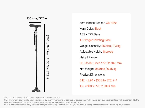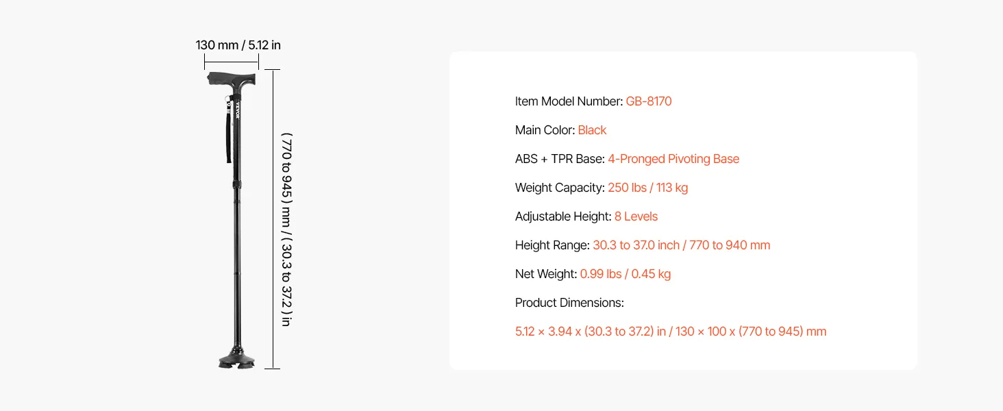 Hoogteaanpassing op 8 niveaus: de opvouwbare wandelstok biedt 8 verstelbare hoogteniveaus (30,3 tot 37,0 inch / 770 tot 940 mm) en kan eenvoudig worden aangepast aan de verschillende gebruikersbehoeften. Het zorgt voor een goede houding en comfort tijdens het lopen, waardoor het een gepersonaliseerde oplossing is voor dagelijks gebruik of korte uitstapjes.